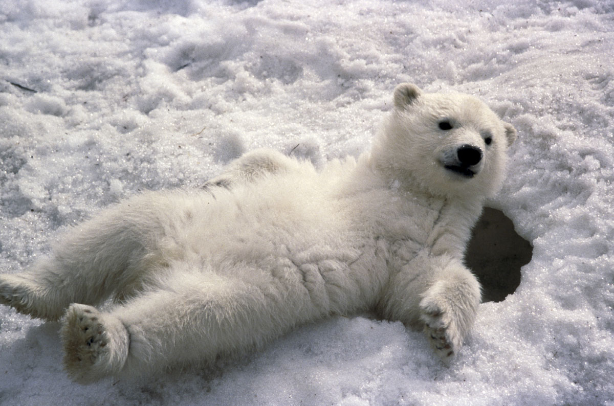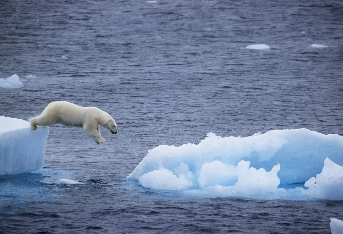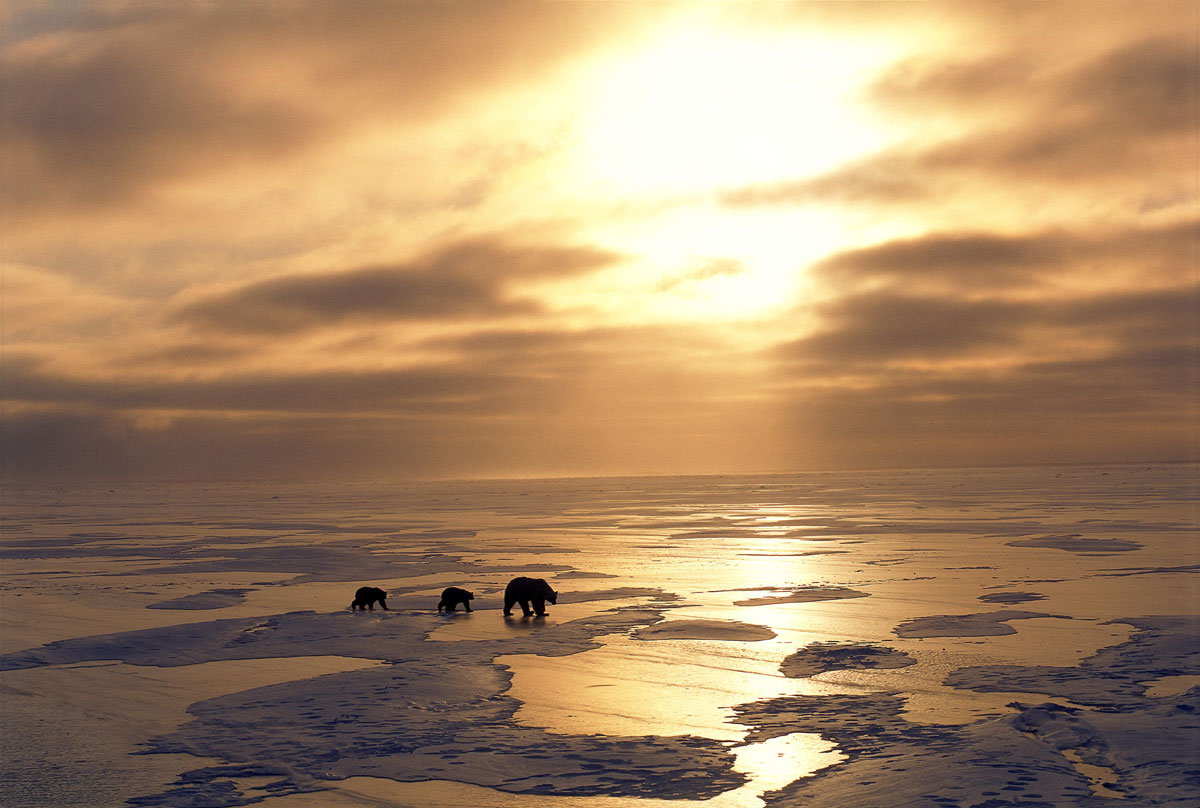 봄이 되어 안전한 장소로 이동하고 있는 어미 북극곰과 새끼 곰.
