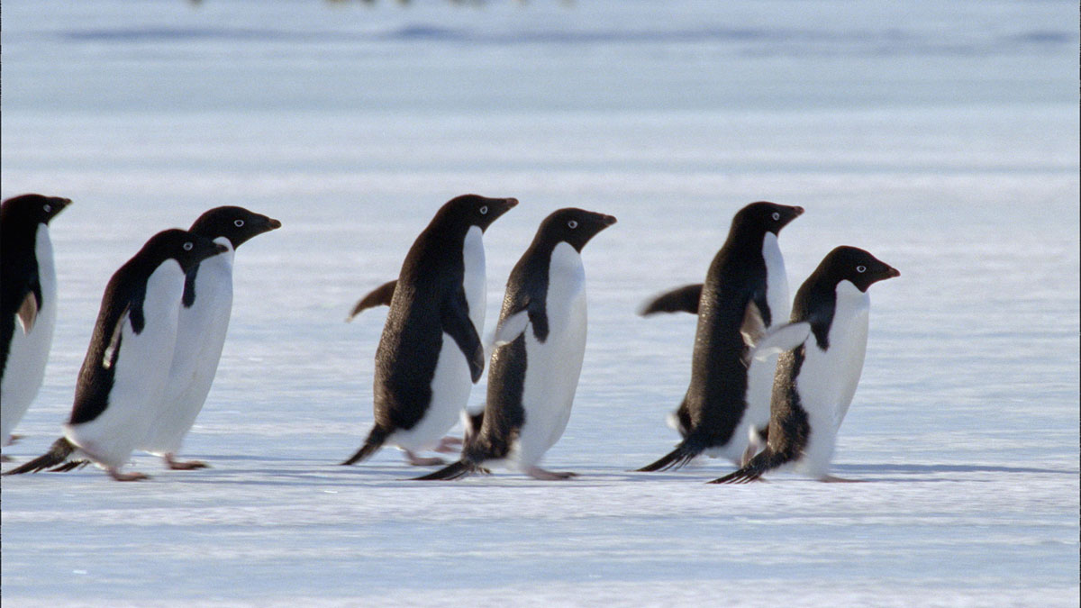황제 펭귄들이 스크럼을 풀고 귀중한 알을 운반하고 있다.